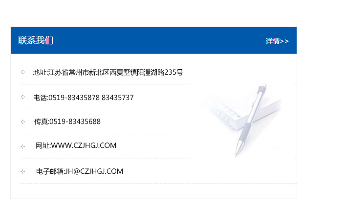 傳真:0519-83435688    郵編:213135    網址:WWW.czjhgj_com.lj-hg.com    電子郵箱:JH@czjhgj_com.lj-hg.com